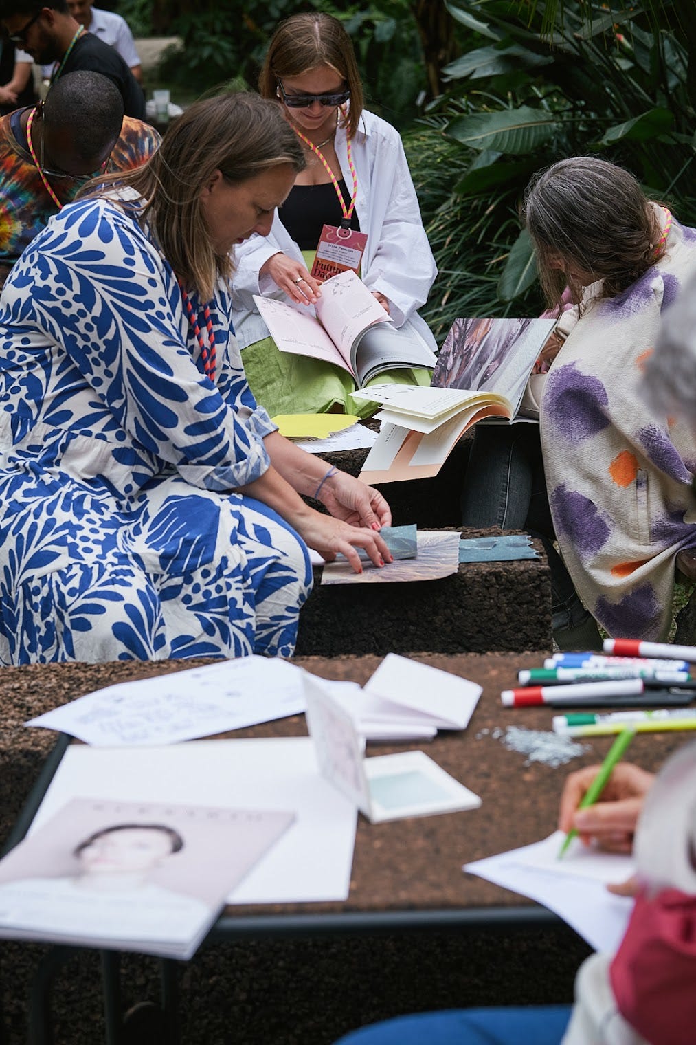 Water drips from ancient ferns in Lisbon’s Estufa Fria. I sit cross-legged on black cork furniture, sketching futures in a handmade zine while conversations unfold around me: unhurried, intertwined, alive. The sound marks time differently than any clock.
